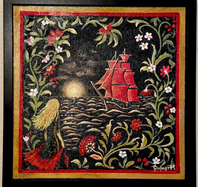 Red blossoms echoed the glowing sails. Art admired in childhood framed a childhood fairy tale.